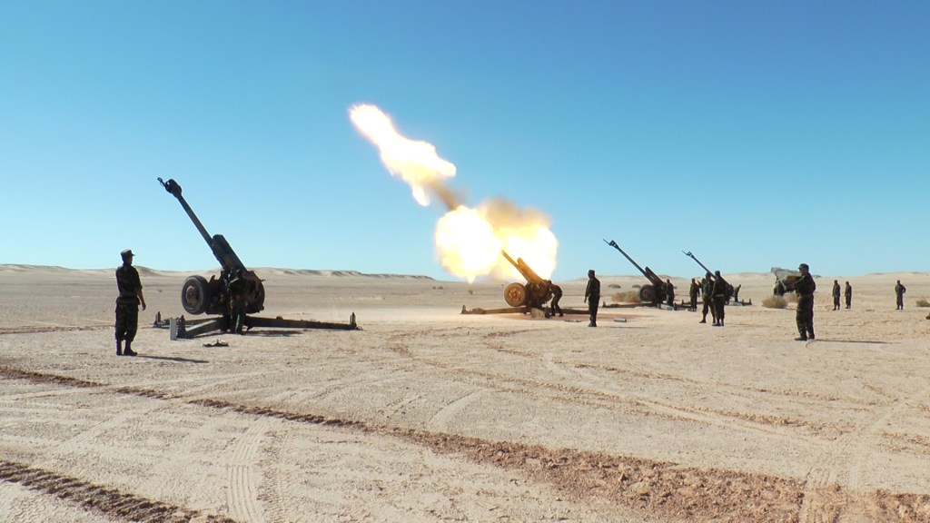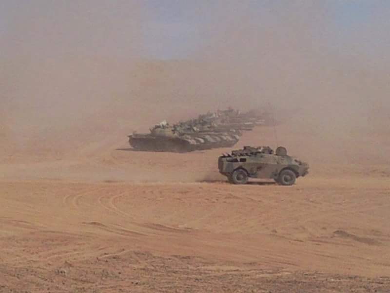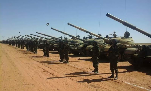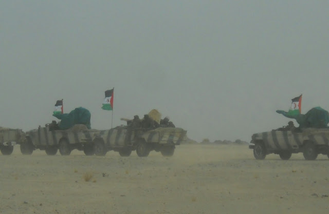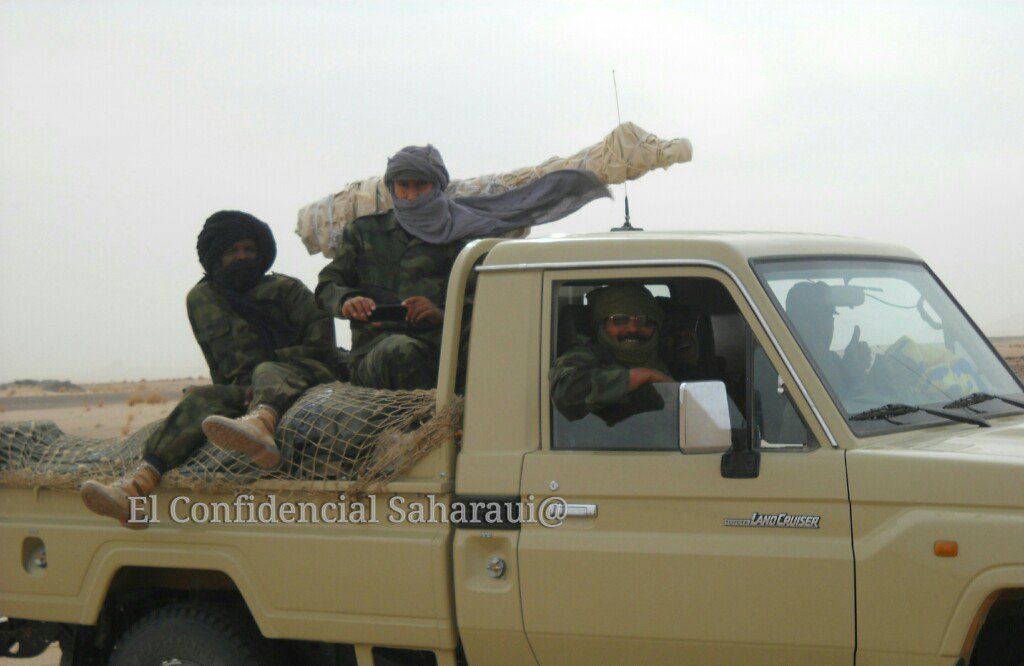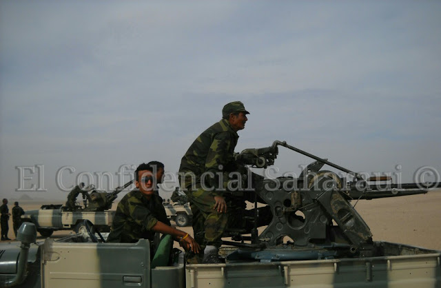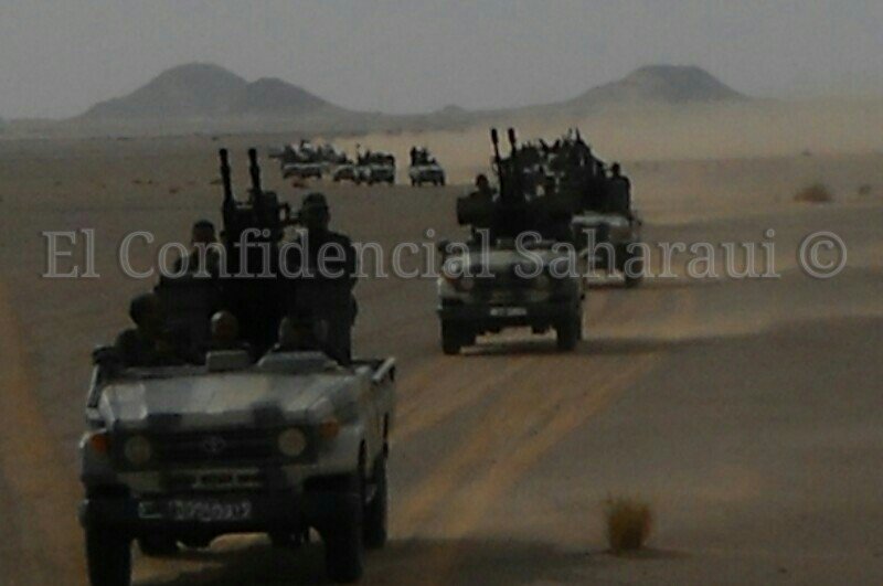 Convoy de Toyota Land Cruiser.Toyota Land Cruiser HZJ79 al centro y la derecha. Un Toyota Land Cruiser FJ45 a la izquierda.Toyota Land Cruiser HZJ79. El primero con montaje ZPU-2 de 14,5mm. El segundo con montaje ZU-23 de 23mm. Foto: El Confindencial Saharaui.Caravana de todoterrenos. El primero es un Toyota Land Cruiser HZJ79. El segundo un Toyota Land Cruiser FJ45. Y el cuarto un Nissan Patrol.Montaje ZU-23 de 23mm. sobre Toyota Land Cruiser HZJ79. Foto: El Confidencial Saharaui.En primer plano, dos Toyota Land Cruiser FJ45 con montajes ZU-23 de 23mm.Montaje ZPU-2 de 14,5mm. sobre Toyota Land Cruiser FJ45. Foto: El Confindencial Saharaui.Toyota Land Cruiser HZJ79 con ametralladora pesada. Posiblemente DShk de 12,7mm. Foto: El Confidencial Saharaui.Detalle del Toyota Land Cruiser HZJ79 con ametralladora pesada. La silueta hace suponer que es una DShK de 12,7mm. Foto: El Confidencial Saharaui.Columna de T-62 (nótese la ubicación del extractor de gases).5 T-62 en primer plano. A continuación, al fondo, lo que parecen T-55. Notése la diferente ubicación de los extractores de humos.T-55. Al fondo, una compañía entera.BMP-1. Al fondo dos piezas remolcadas D-30 de 122mm.Cañón 2A28 «Grom» del BMP-1. Foto: Jalil Moh. Abdelaziz.Vista de la trasera del BMP-1. A lla derecha, proyectiles PG-9 de 73mm. Foto: Jalil Moh. Abdelaziz.Sistema de misil antiaéreo de guía infrarroja SA-9 (según denominación OTAN).Posiblemente un SA-9 con los misiles en posición de marcha.Lanzadera de misiles 2P25 del sistema 2K12 KUB (SA-6, según denominación de la OTAN). Foto: Jalil Moh. Abdelaziz.Sistema 2K12 Kub con las lanzaderas 2P25 a los lados y en medio el vehículo 1S91 con el radar.En este orden: 4 sistemas antiaéreos propulsados ZSU-23-4 Shilka, dos lanzaderas 9A33B del sistema de misiles antiaéreos 9K33 Osa (SA-8 en denominación OTAN), dos lanzaderas 2P25 del sistema 2K12 Kub, varias piezas de artillería por identificar y 3 lanzadoras de cohetes BM-21.Nueva foto del mismo día y lugar de la anterior donde se aprecian mejor los lanzadores 9A33B del sistema 9K33 Osa (SA-8 según la denominación OTAN).Piezas de artillería D-30 de 122mm. Al fondo una lanzadera de cohetes BM-21 Grad.